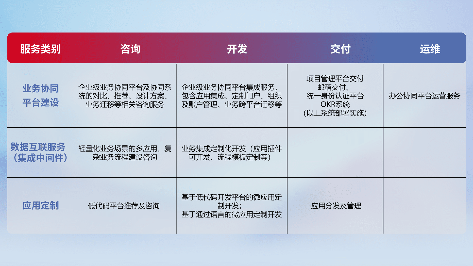 针对钉钉、、、、企微、、、IDaas等平台级产品提供产品的规划、、方案、、、、交付、、定制化开发等服务,,,实现如统一协同办公、、、智能客户服务、、、、混合会议管理、、智能数据查询、、等业务场景,,,实现数字化转型。。。。